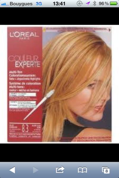 À la maison, j'ai un kit mèches blondes (qui est vendu avec couleur experte l'oreal 8.3 blond clair doré -> couleur que j'ai faite en 1er hier) et la coloration "noisette' que je faisai de septembre à hier !