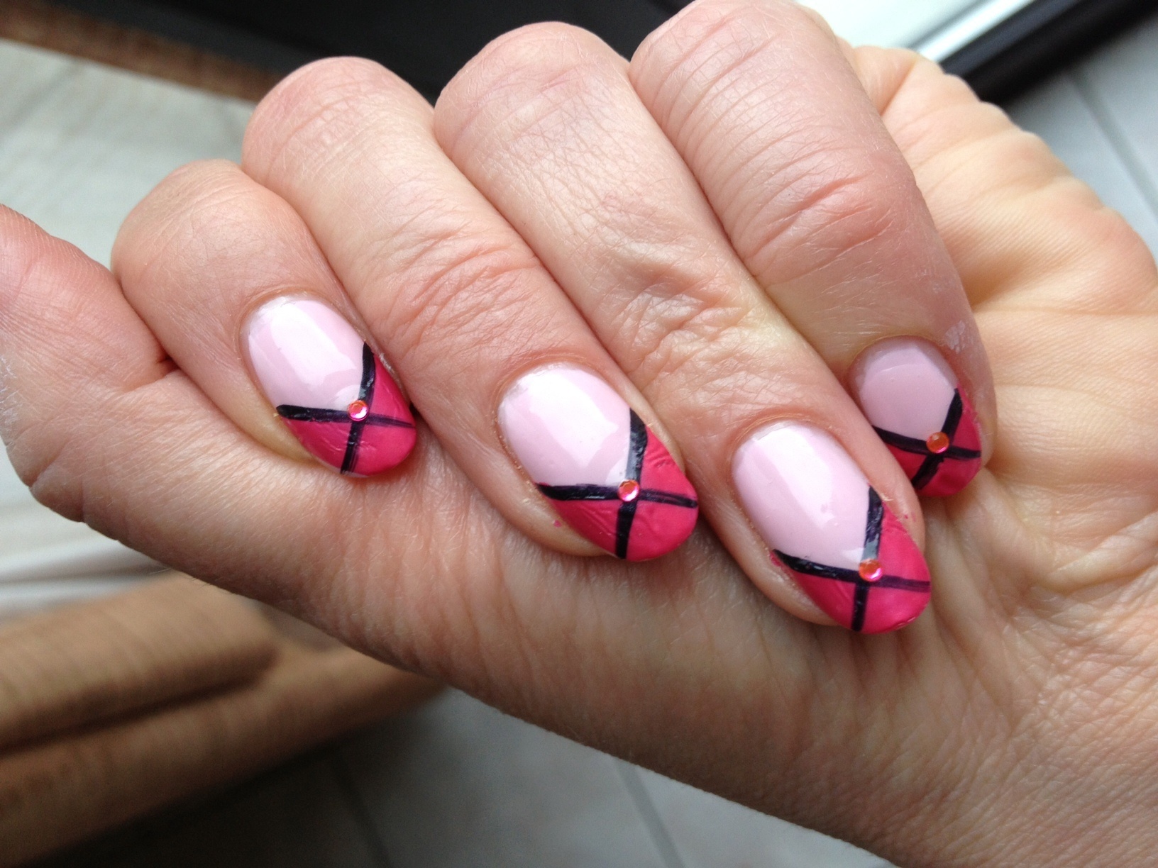 Concernant la photo avec la croix noire, j'ai eu un soucis de réaction du vernis magenta avec le top coat semi-permanent que j'ai mis. Des plis sont apparus mais ils se sont atténués après...
