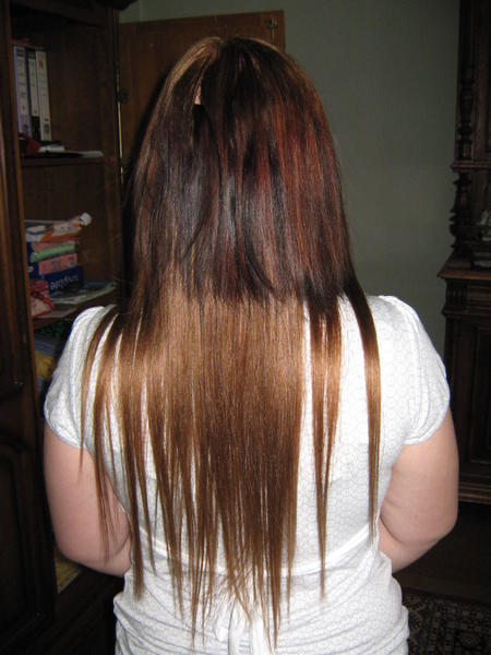 Tu vois par exemple cette fille fait que des teintures, je lui ai donc conseillée de prendre des extensions châtain noisette, et comem elle habite prés de chez moi et qu'elle reviens tout le temps chez moi pour ces cheveux, je lui ai fait moi même sa teinture complète,donc tête + extension.Et voilà ce que sa donne :3-blink: et par al même occase je lu iai donnée quelques ptites technique pour que les clips soient invisible quoi qu'elle fasse dans ces cheveux, nattes, couettes haute,les laissé détaché,attaché qu'une partie ...:)