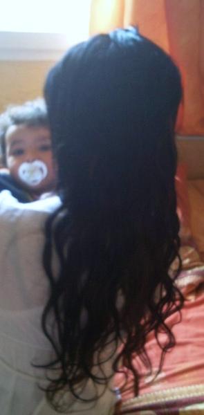 Ensuite toute excitée je me les pose nimporte comment lol éparpiller un peu partout, et ma mere me dit "mais c'est bien ta perruque, fais voir j'essaye" donc je lui pose, et elle ne voulait plus me les rendre, elle qui as de gros trous dans les cheveux sa a tout recouvert.