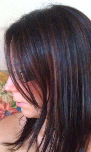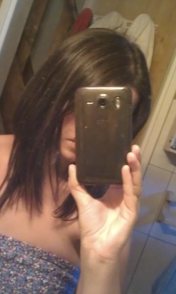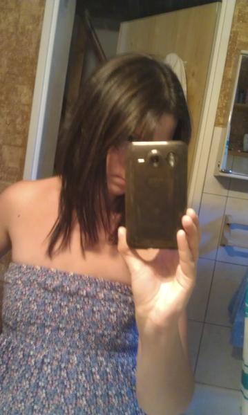 Voila ce matin je suis allée chez le coiffeur pour faire des meches, je lui est expliqué que je ne voulais pas des meches blondes car sur du brun je trouve pas ça jolie...donc elle m'a fait des meches et une patine (une couleur quoi lol) je l'ai entendu parler à une autre coiffeuse et elle disait (ta mis du bleu ou du rose, je pense que c la poudre décolorante elle a mis bleu apparament...)et j'ai des jolies reflets au soleil mais c'est pas flagrand...en tout cas ça rechaufe un peu mon teint ! et puis j'ai fait une coupe aussi ! allez assez discuté place aux photos avant/après !je referait des photos car la luminosité est pas top désolé on voit pas vraiment les meches mais l'eclaissisement