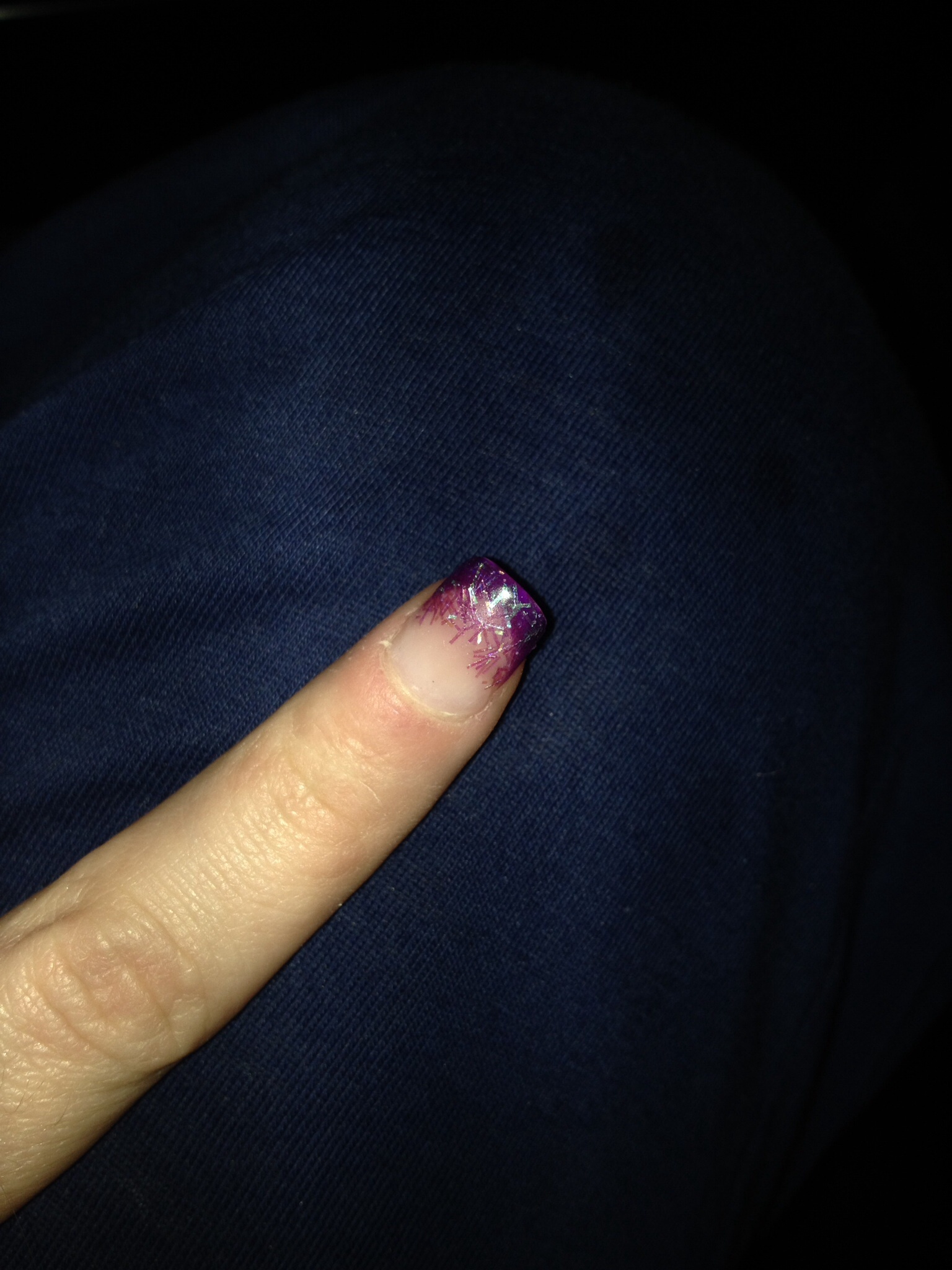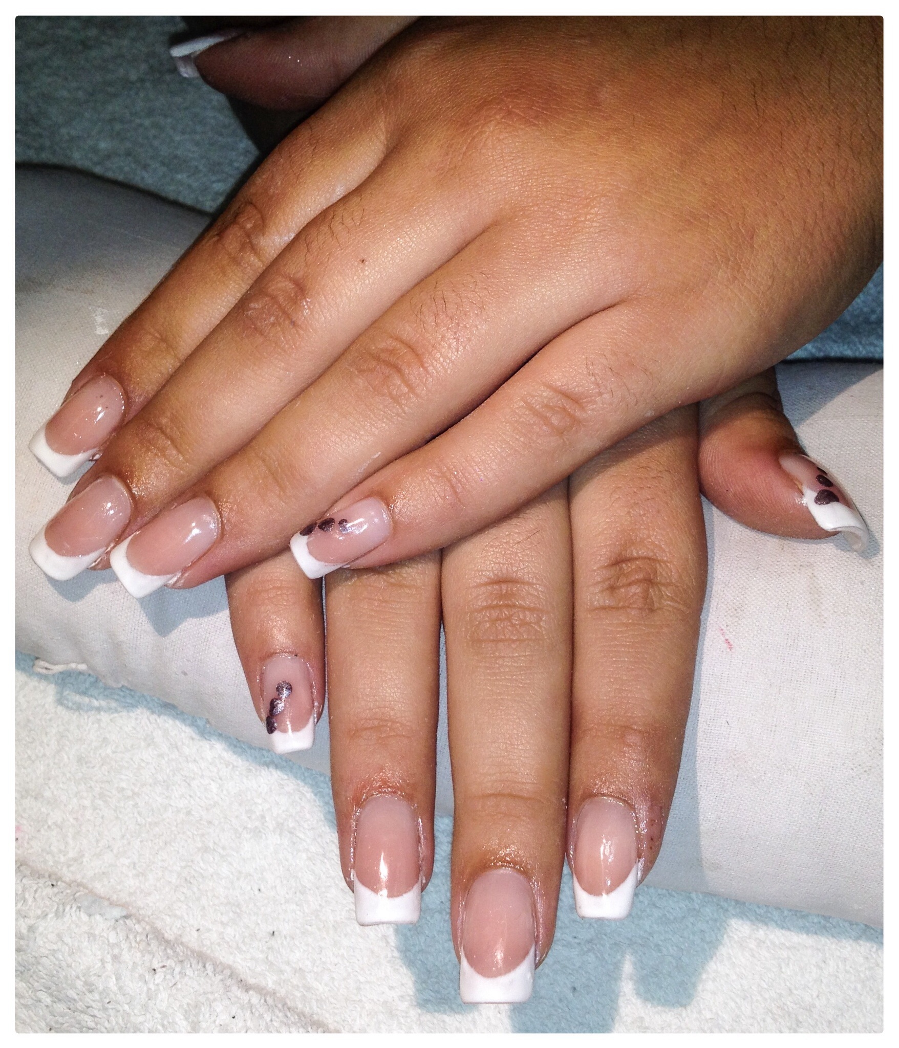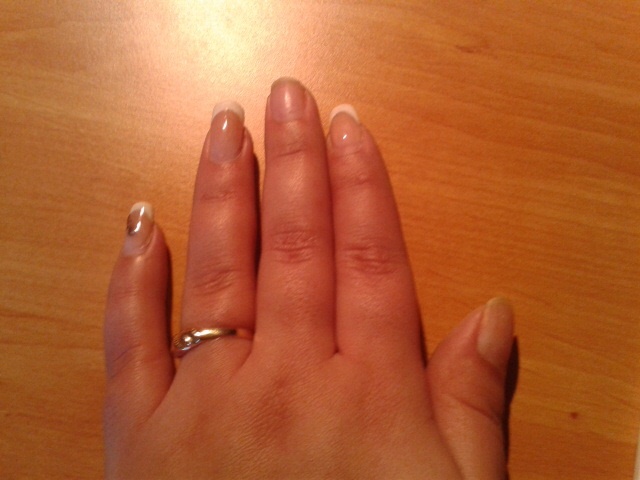 La première pose que je lui avait faite fin août, mais qui pour moi n'était vraiment pas top, elle l'a gardé 6 semaines!! Mais la j'y retourne car elle en a perdu 2 (1 au bout de 10 jours et l'autre hier...grrrr). Je pense que j'ai du toucher les peaux sur le côté ou alors elle s'est choquée et ne veut pas me le dire, ou je n'ai pas assez matifié la plaque durant la prépa. J'ai la photo de sa main qu'elle m'a envoyée hier soir.