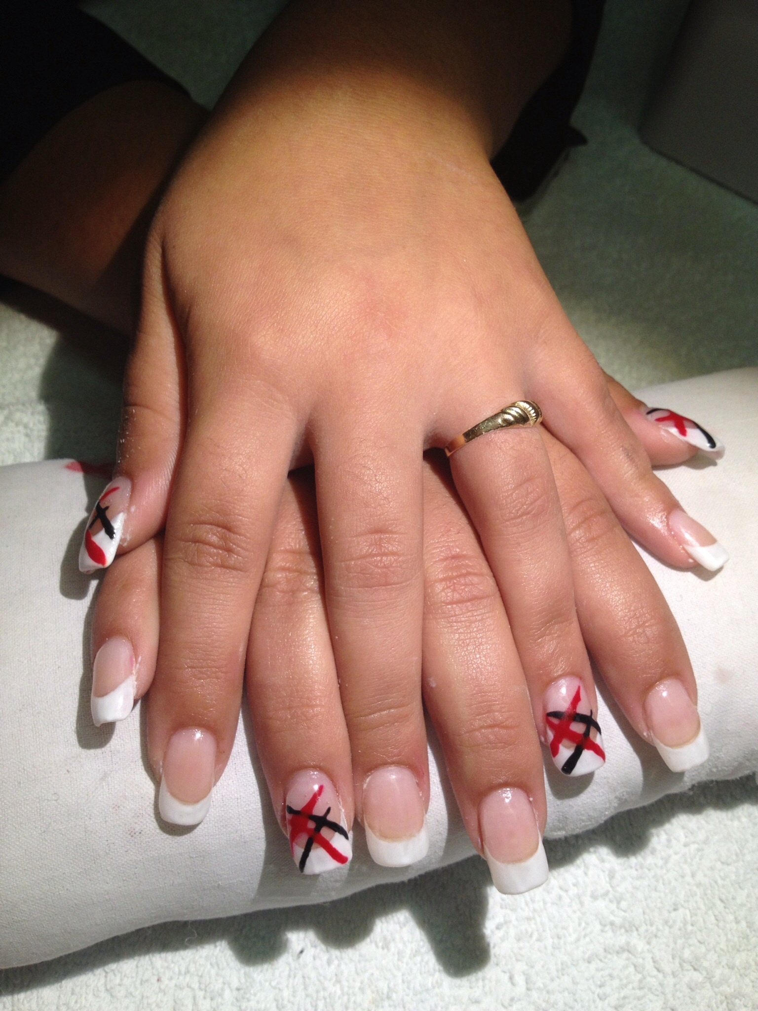 La première est une pose sur ma meilleure amie pour son mariage au Portugal au mois d'août. C'est un rallongement au chablon avec une incrustation de dentelle sur les annulaires et un sticker en plus.