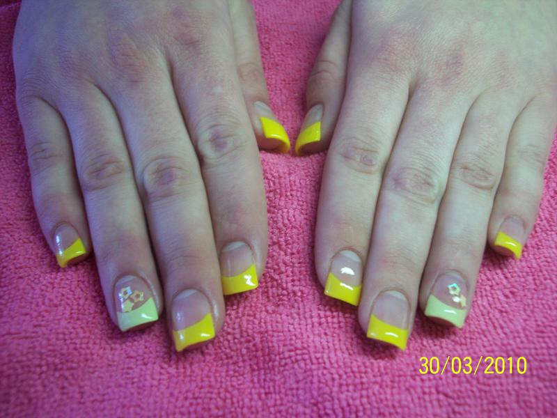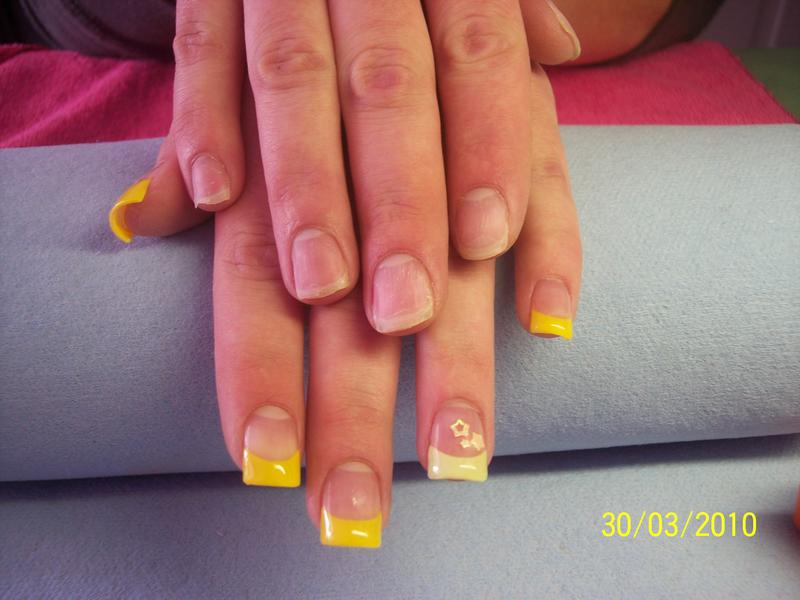 Voici la pose que je viens de faire. La capsule de l'annulaire est verte pale et les autres sont jaunes. Les décorations sont jaunes au départ mais elles ont pris la couleur de la capsules