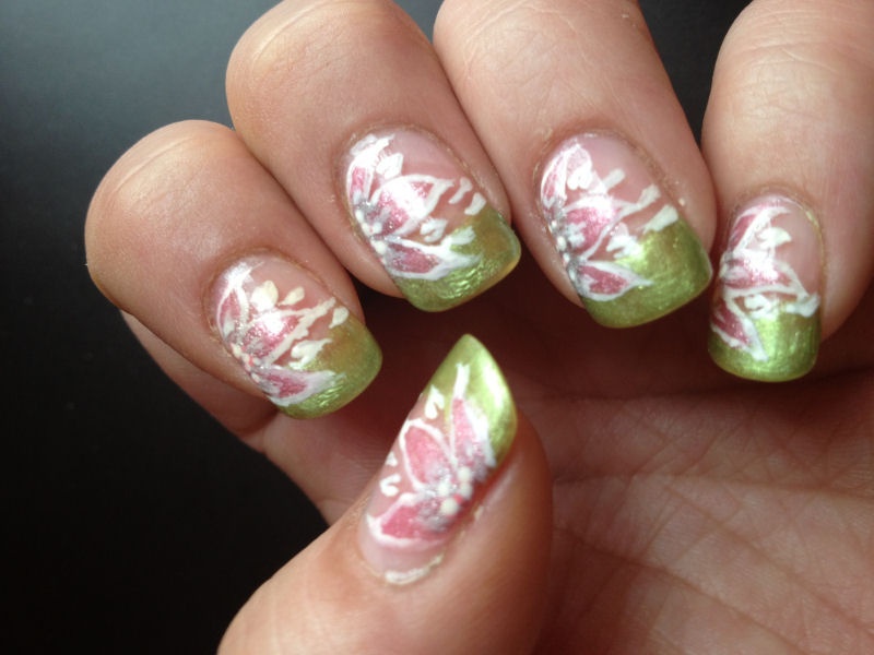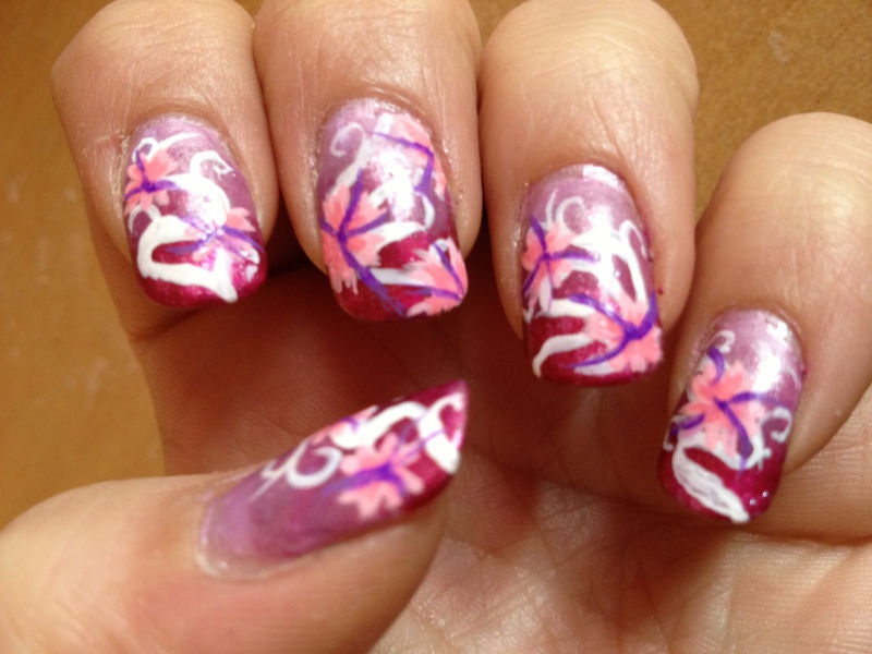 9- j'ai voulu faire des tiges de haricot avec des petites fleurs sur mon dégradé rose et ça a donné ce nail art tout bizarre lol