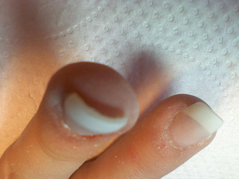 Trop marre, encore hier alors que tout était ok, sec etc......quand j'ai dégraisser le gel voilà le résultat, je ne sais si on voit bien mais la french au bout de l'ongle envolée grrrrrrr et regrrrrrrrrrr. Obligée d'enlever, refaire, la poisse quoi. C'était un dernier essai, je garde l'airbrush pour les décos.....:confused:
