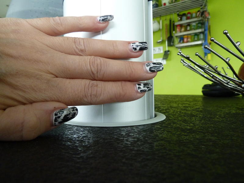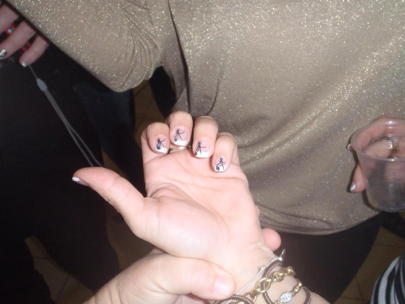 Je lui avais demandé de me faire une french noir avec de petits lacets rouges au milieu. Pour moi, il n'y avait rien de compliqué o-O. Elle a commencé avec le stamping et un dessins super kitsch qui ne me correspondait pas du tout lol. Ensuite elle a effacé parcequ'elle arrivait déjà pas à posé le stamp comme il faut et ensuite au pinceau nail art (pour faire des petits traits qui se croisent enfin.). Ca c'est terminé en espèce de signes chinois ratés et tout le monde me demande ce qui est dessiné sur mes ongles o-O.