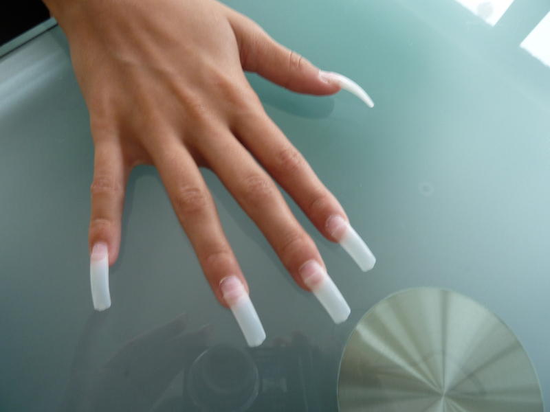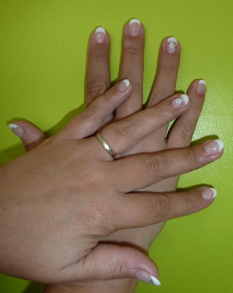 3/ J'ai utilisé un pot de paillettes. Base, camouflage (car tips), une couche fine de construction, catalyser, dégraisser, french en gel transparent, tremper le doigt dans le petit pot de paillettes, retirer sans trop frotter le surplus de paillettes avec un large pinceau, catalyser, brosser l'ongle pour enlever le trop de paillettes puis continuer la pose... construction, finition...