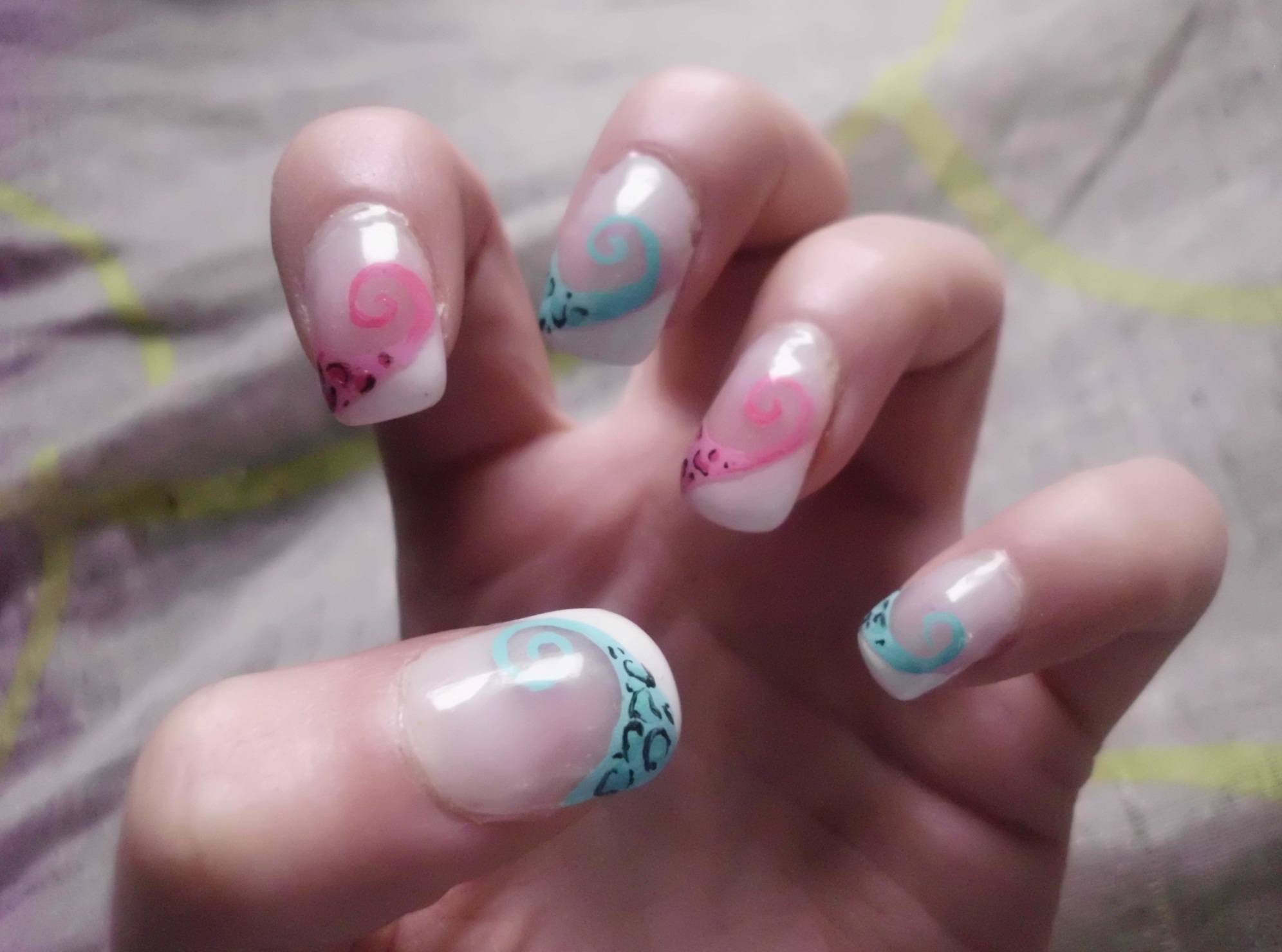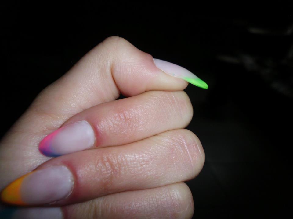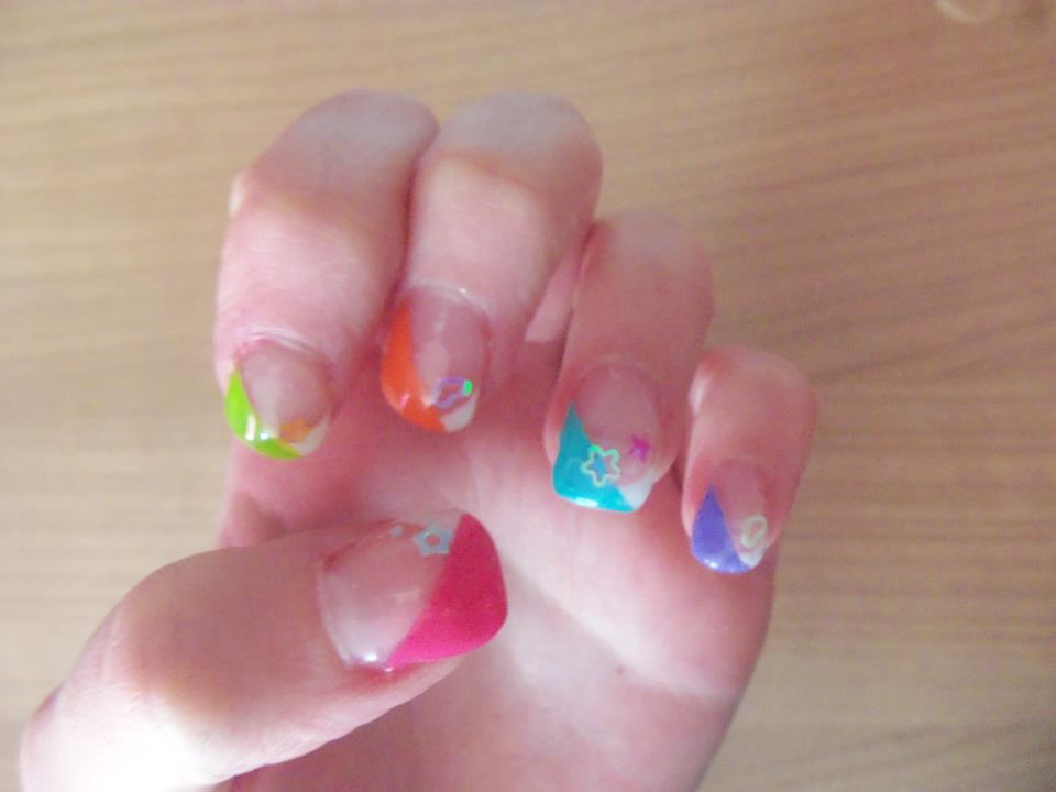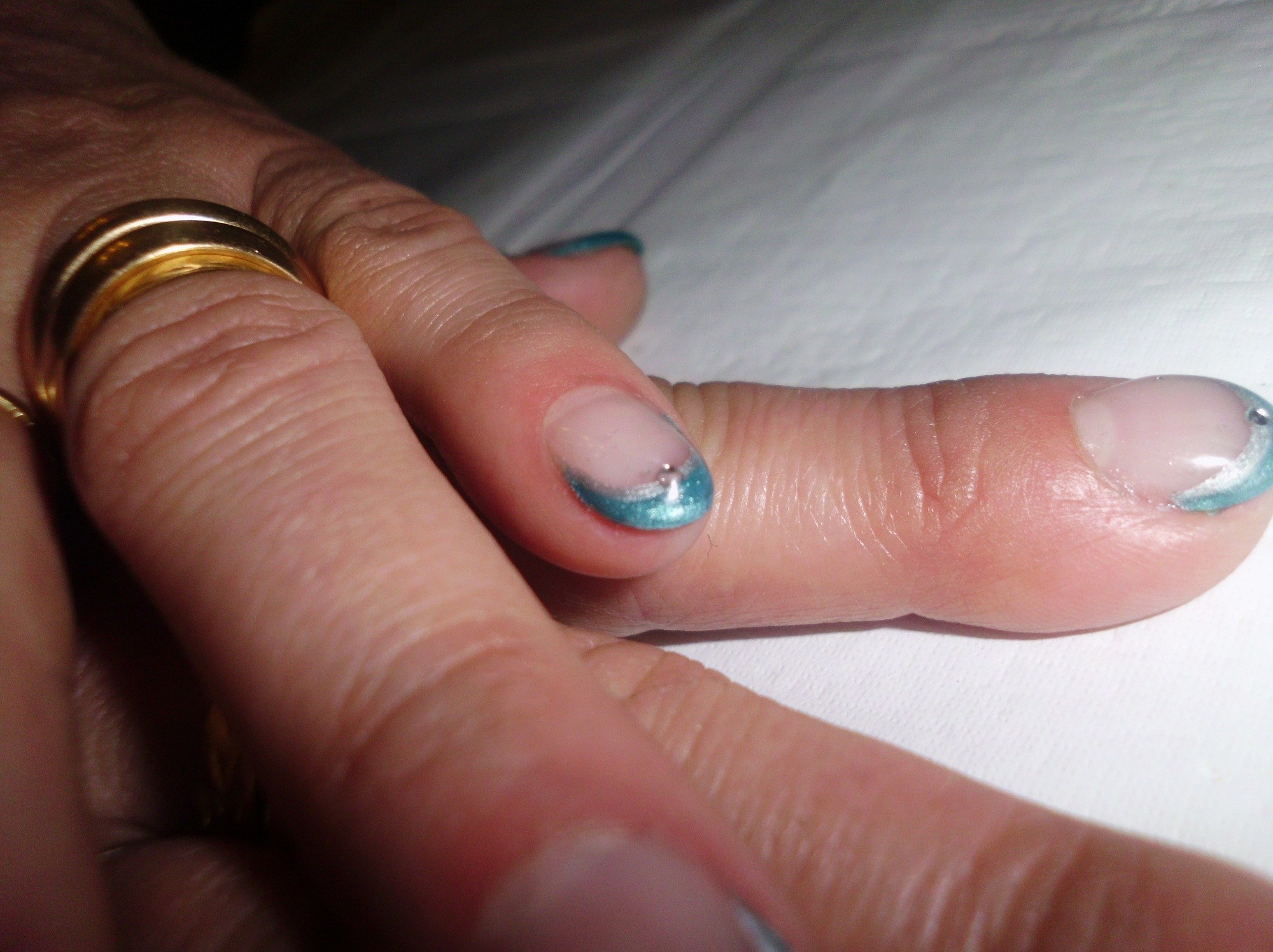 (pose sur ma belle soeur, qui ronge ses ongles, ses ongles pique vers le haut d'habitude, ici j'ai testé le chablon sur elle pour modifier l'inclinaison, ça va faire 2 semaines qu'elle les a, et il n'y a aucun décollement ^^)