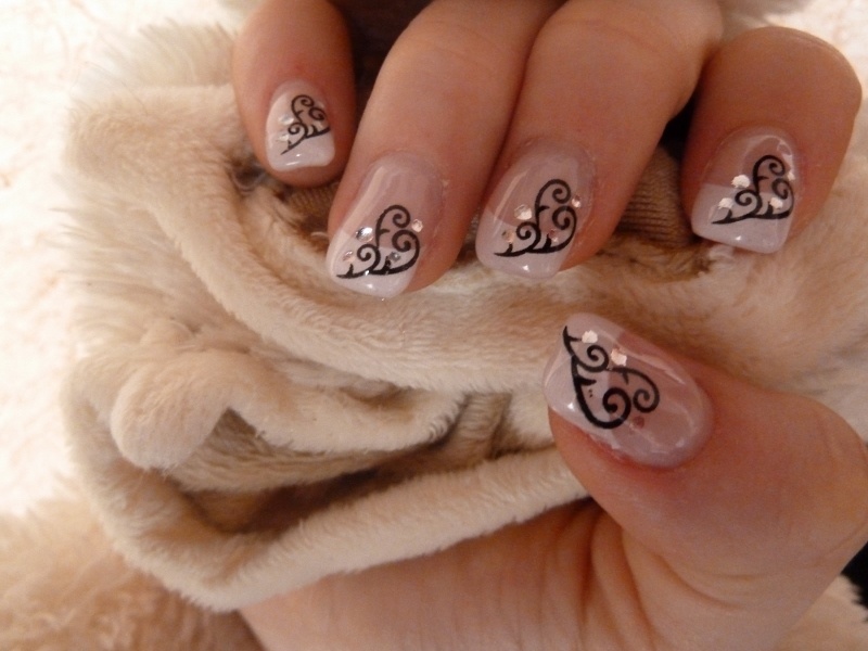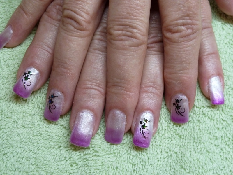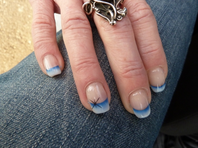 photo 3 : 2 couches de gel nacré + french floutée airbrush + pochoir airbrush sur caps
