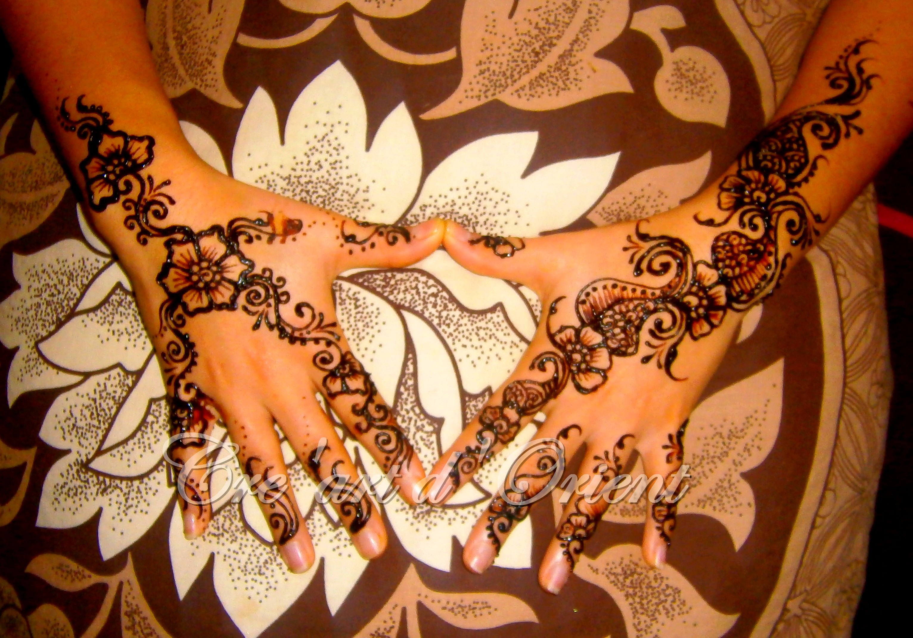 pour le temps de travail tout dépend de la complexité des motifs, mais par exemple pour les mains chargées ça a du me prendre environ 1h30, sachant que pour les mariages on fait les deux faces des deux mains et les pieds...lol,