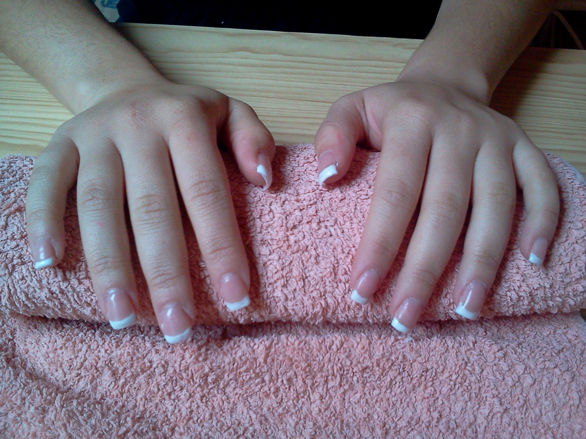 Pour les défauts je trouve certains ongles trop gros, mais elle en avait qui en étaient vraiment plus larges que d'autres... :/ et les frenchs pas assez souriantes et trop petites à mon gout mais elle préférait comme ça. Sur le petit doigt on dirait que la french est super boudinée mais c'est un effet de la photo. Par endroit c'est trop épais au cuticules.