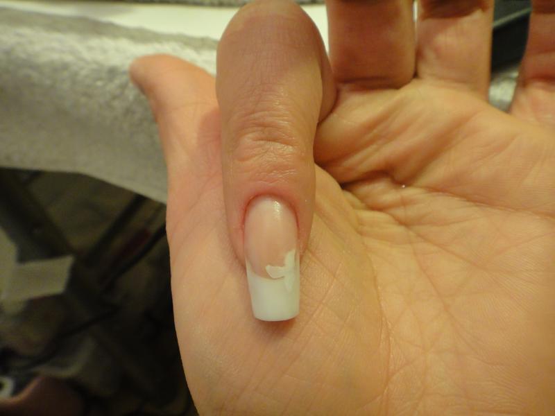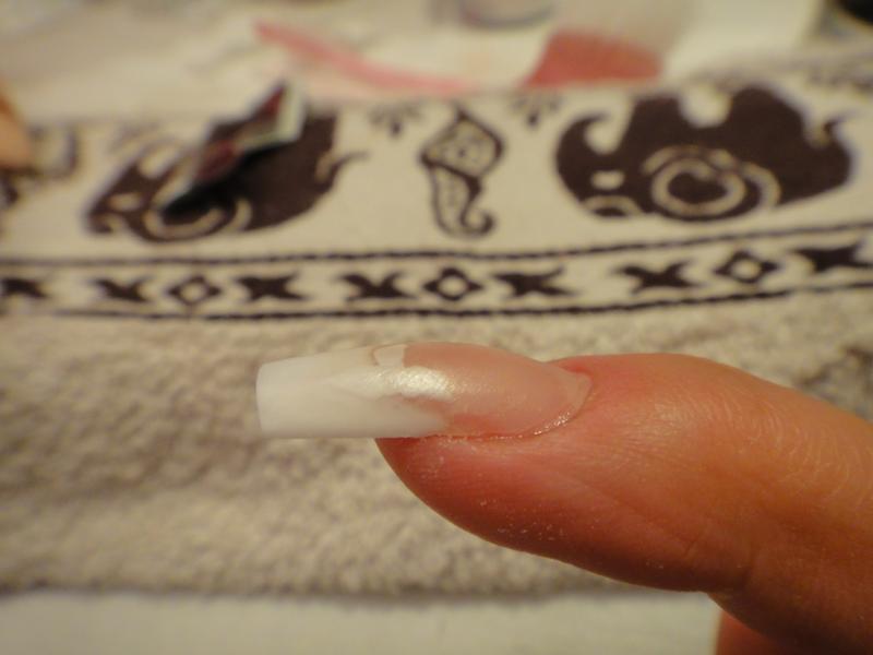 j'ai fait une grosse boule pour mon cover en reverse (pose sur chablon), puis mis une boule de french que j'ai mis en boudin le long de la cormiche puis j'ai aplati, j'ai remis une boule french car je n'en avais pas assez pour faire la longueur... puis clear sur tout l'ongle
