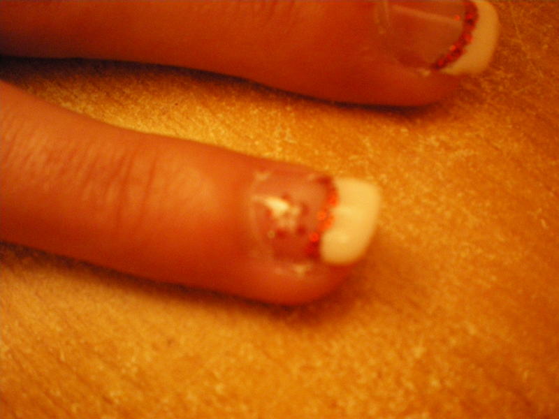 voila mon premier remplissage qui n'a pas été simple , car base très courte (pas de gel rosé pour prolonger la plaque) et beaucoup de cuticules génantes! De plus jai essayé de mettre des paillettes sur le bord de french ! bref ...voici les photos