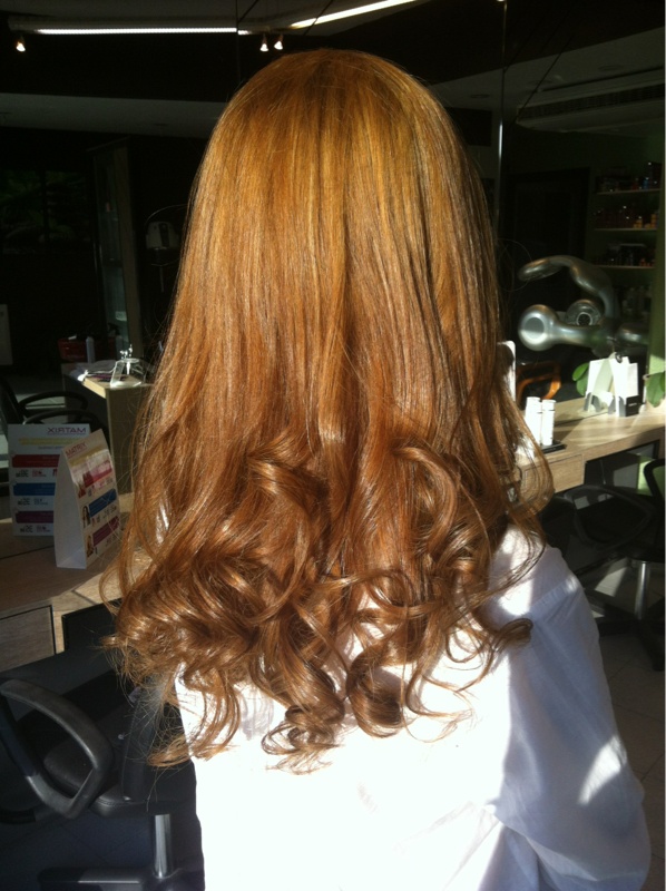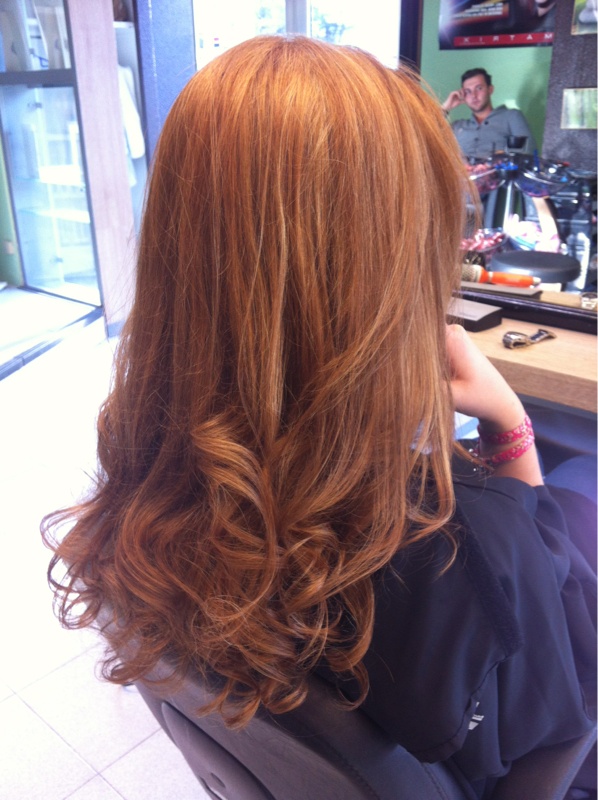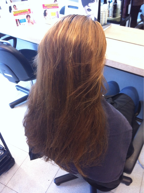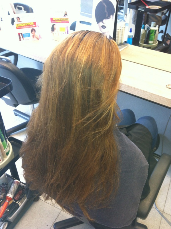 Mèches de 2 nuances (7.3 et 9.03) puis pour la base moitié 7.03 moitié 8.03 et pour finir botoxe. 6h de boulot au final... Toutes la technique réalisée par mon apprentie, j'étais fière