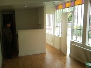 L'ntérieur:Coté où il y a le bar et le grand radiateur au mur ce sera mon salon où je recevrai mes clientes....Et le petit couloir et la pièce reservée à la formation!J'ai 2 pièces