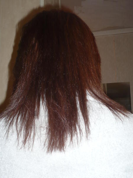 5e photo lissage plaque vue de dos, je n'ai miraculeusement plus de fourches, cheveux doux et lisse et brillants, pas assez de lumière pour le constater