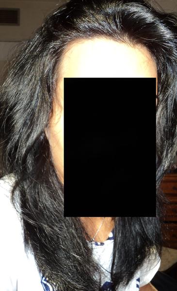 Photos 1 & 2 : Cheveux sans brushing, au naturel, colorés et lissés régulièrement, ondulent légèrement, secs, abimés aux longueurs et pointes.