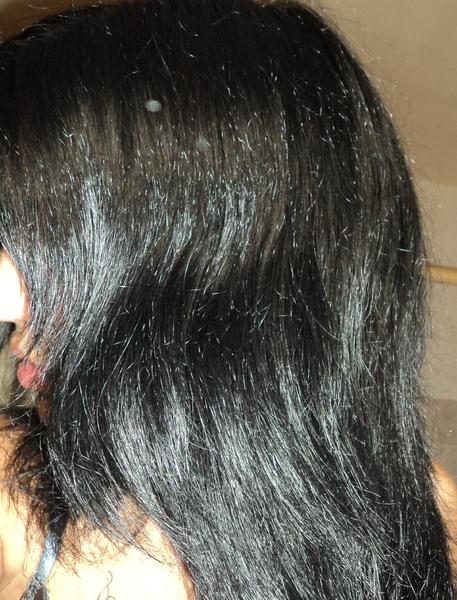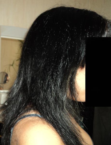 Photo 6 : Application de la kératine (le moment où j'ai oublié que ca n'était pas un masque à rincer mais bien quelque chose qui se gardait :D d'où le trop plein de produit)