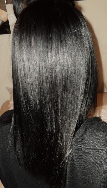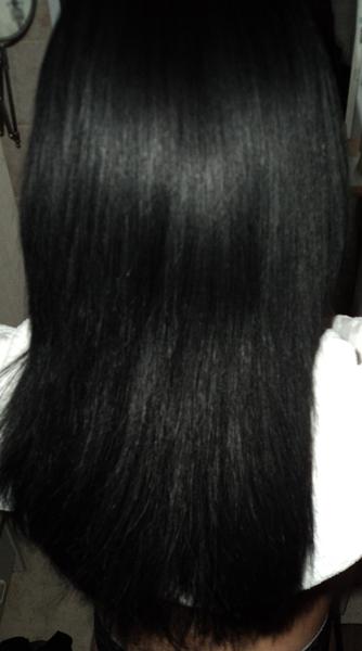 Photos d'après : Après passage des plaques, cheveux doux et souples. Ils sont encore un peu rêches et surtout assez poisseux même si j'ai bien fait pénétrer la kératine, comme il y en avait trop à la base, ca reste. Mais je suis contente pour l'instant, à voir après le shampooing la brillance etc. Voilà :)