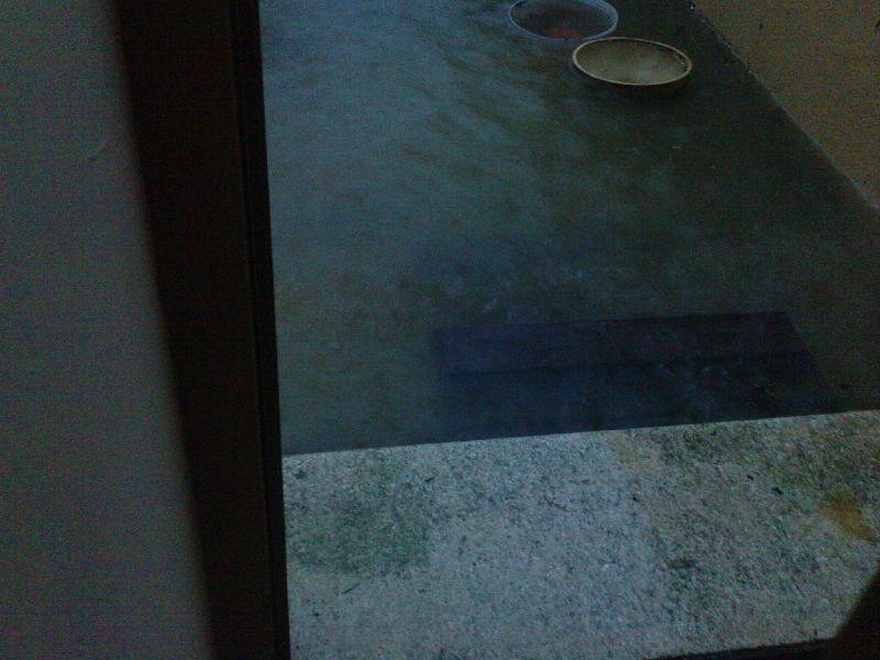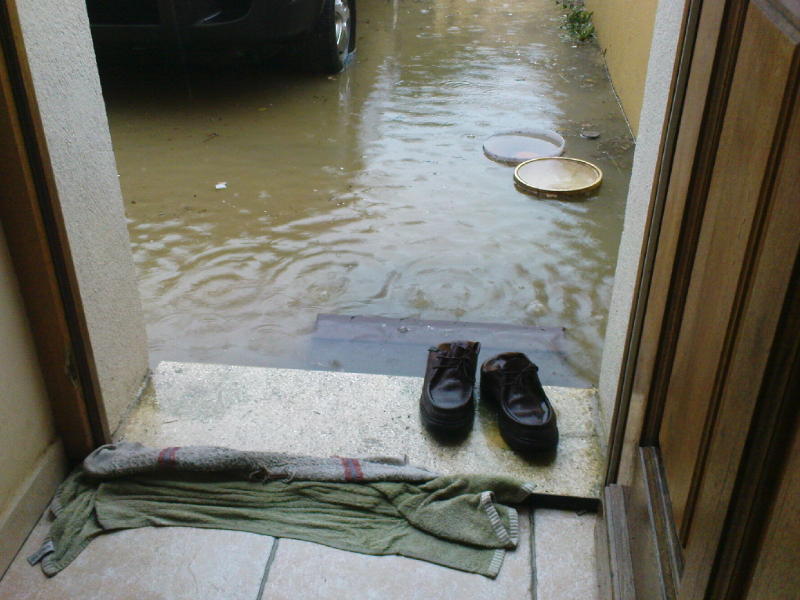 Photo 5 : Là vous écoutez votre voisin et vous descendez comme une tarée mettre des serviettes devant la porte. Vous ouvrez la porte histoire de juger la hauteur de l'eau et là vous tombez presque dans les pommes. Le lac est à 3 cm de votre porte
