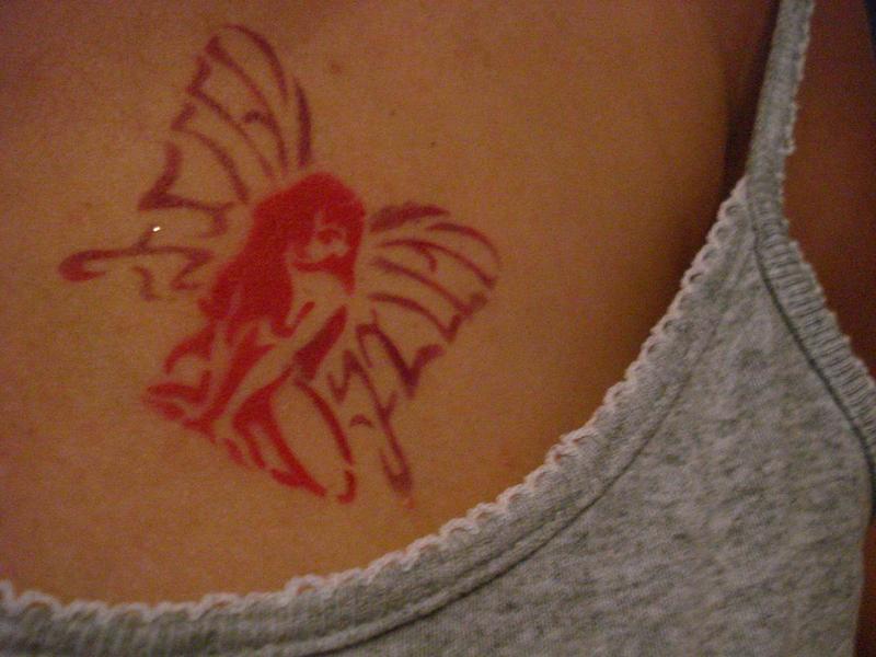 voila apres avoir investi dans un airbrush pour ongles , je me suis dit pourquoi pas proposer des tatouage éphémère , je me suis donc lance sur moi pour essaye se soir , un papillon sur la cheville et une elfe en haut de la poitrine , je trouve sa jolie maintenant a voir conbien de temp sa va tenir