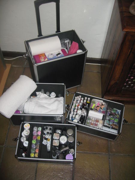 Coucou le forum !! Je suis tellement contente que je voulais partager çà avec vous !!!!! Voici les photos de mon trolley arrivait hier , évidemment je me suis empressé de ranger tout dedans et comme vous pouvez le constater , il est juste !!! Donc 1er étage , résine de base , gel , huile et primer , peinture, et résine couleur opaque ; 2éme niveau toute la déco ; liner et résine couleurs paillette...3éme niveau (le+grand ) , lampe , lampe uv , ponceuse , aspi , ponceuse pédicure, essuie tout, repose main serviette ;dernier niveau , encore de la déco , boite à pinceau ,lime , dégraissant, antiseptique , crème pour les main, godet et chablons!! A vos coms !!!