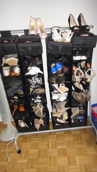 je sais pas exactement mai il y a 36 casiers et en moyenne j'ai 2 voir 3 paires par casier lool mais j crois que y a plus de la moitié que je met très très rarement. A par sa cette méthode est très économique et prend plus de pair qu un meuble a chaussure qui est plus cher. J'ai acheter le suspendoir (dsl pour le le mot lol) à genre 10 - 15 euro chez ikéa et ensuite j ai pris 4 rangée de casier de 9 trous qui était dans les 8 euro la rangée donc sa m est revenu a moins de 50 euro pour ranger toutes ses paires alors que les meubles a chaussures sont assez cher et prenne pas autant de paires