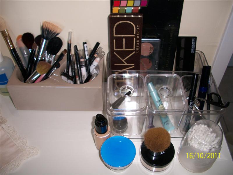 ah oui les filles, j'ai changer ma coiffeuse, j'ai acheté celle de ikea mais qui est plus petite avec plateau de verre, voila comment j'ai ranger .les pinceaux c'est provisoir et je suis en train de customiser une boite a mouchoir :)