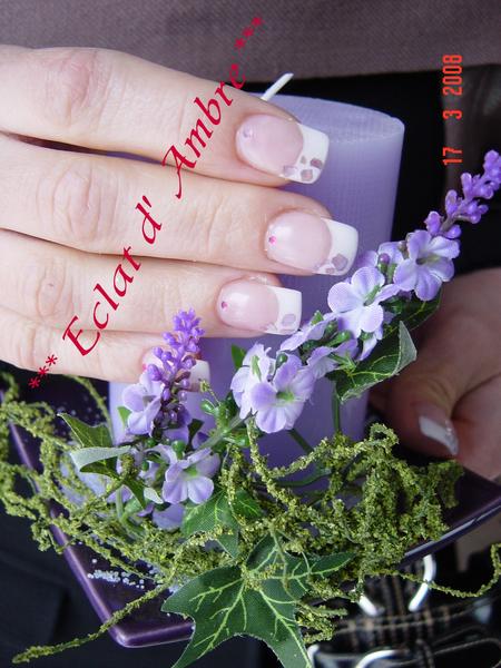 Avoir pose simple avec incrustaton de nacre mauve , plus fernch blanche et strass fuschia sur la lunule.A vos coms, merci....