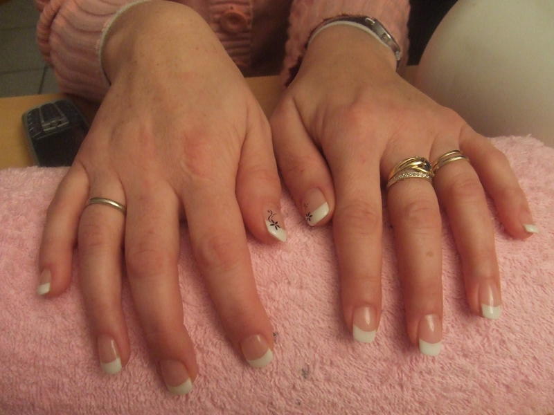 Oups j'ai oublié ma collègue Angélique avec qui j'avais fait ma formtion chez Sabine68, donc la pauvre précédemment avait une très jolie pose naturelle et elle s'est pris les doigts dans un appareil de la scierie de son homme donc il a fallu tout arraché sinon ses doigts y passaient aie aie aie mais bon çà a repoussé mais il sont plus ou moins fragile donc capsules sur 6 doigts et on a tenté une petite longueur ce qui donne un effet un peu boudiné mais çà lui plait on verra pour faire un peu plus long au prochain remplissage!