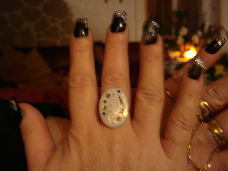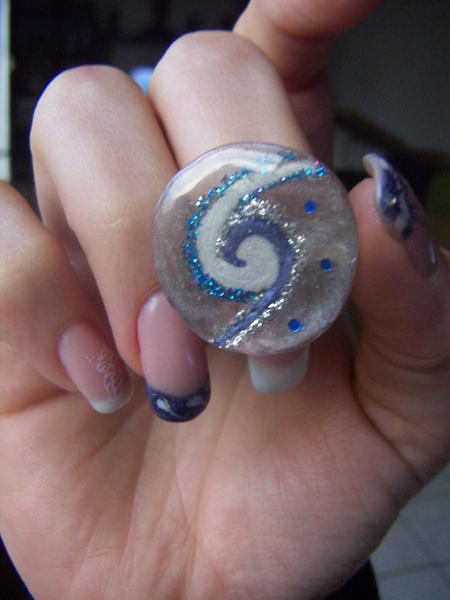 voici ma derniere bague en gel bleu et blanc legerement nacré+ paillettes argent , bleu et strass bleus