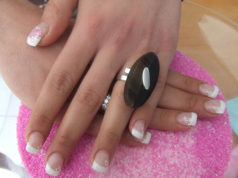 Lisa après 4 semaines et un pouce cassé (en faisant le crépi m'a t elle dit!) a fait une french blanc pailleté + stickers...