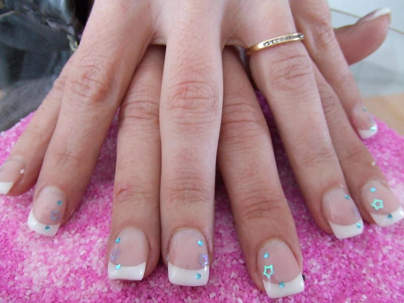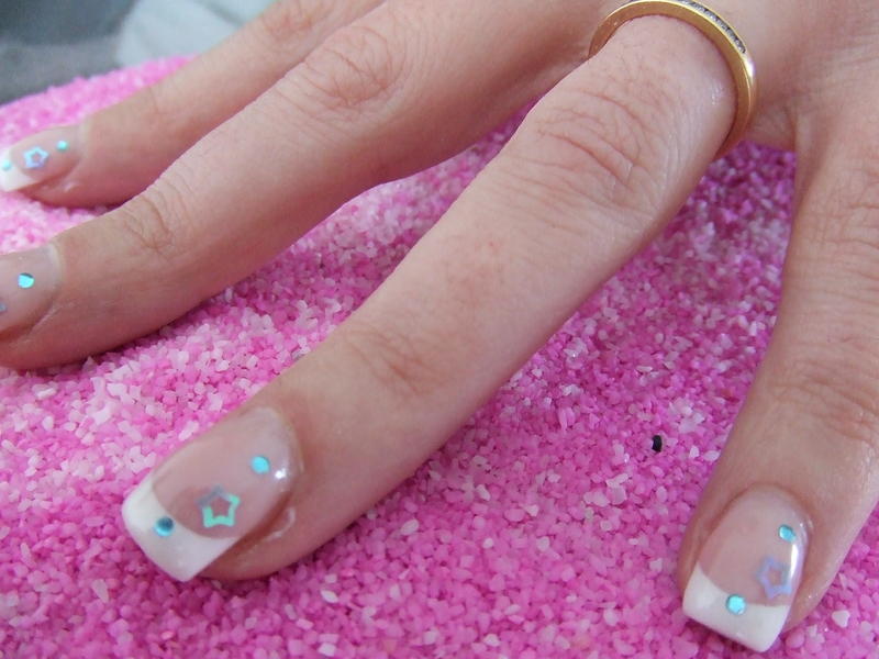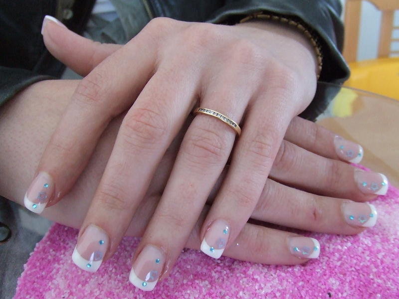 sandrine s'est lassée de la french en biais avec le liner argentée et on fait plus simple et plus bleu surtout (elle adore).. tenue 3 semaines sans décollements..