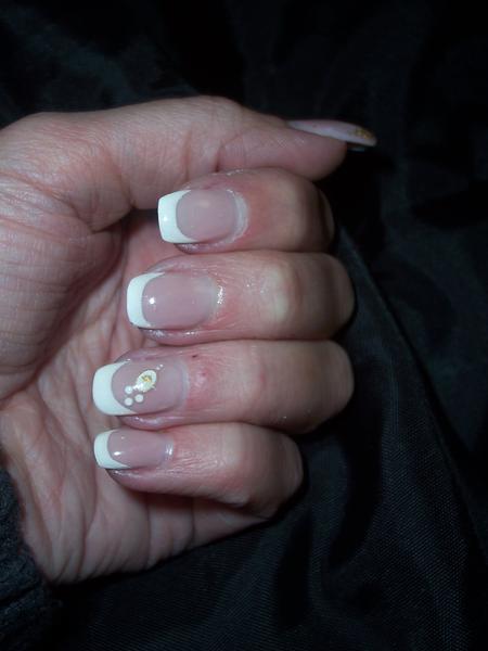 J'étais déjà lassé de mes pailletes argentées, du coup je refais une déco soft ! french blanche et french dorée paillettes sur le pouce + stickers sur l'annulaire.