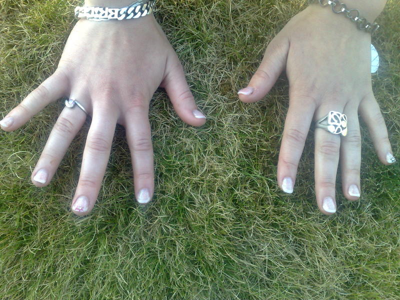 Salut à toutes !!! Voici ma nouvelle pose... je travaille dur ! lol ma main gauche avec la bague est un gainage à part le pouce et l'autre main tout a été rallongé avec chablons. La 4eme photo est une pose courte pailletée faite sur ma cousine ( dommage on ne voit pas gd chose sur la photo). et la derniere photo ne vous moquez pas svp lol. mon premier essai peinture acrylique sur une capsule. Je precise que je ne l'ai evidemment pas collé sur mon ongle, je l'ai juste posé dessus pour la photo. Merci de me donner vos commentaires positifs ou egatifs. Je precise que je travaille avec des gels soak off de chez adnails.