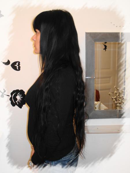 Coucou, nouvelle pose aujourd'hui avec les mèches de hossine (trés belles), en 65 cm noir, mais alors BLONDE queje suis pas de photos avant (grrrrrr) juste après ... elle avait un carré plongeant long, avec cheveux assez fins, il y a 120mèches, un peu plus aurait été bien mais au final comme elle a les cheveux fins cela ne choque pas (du moins pour ma part et la sienne).Sur la photo ou on voit ma cliente de prfoil on eu apercevoir ses cheveux lisse sur le devant et voir à peu prés ou ils arrivaient à la nuque.