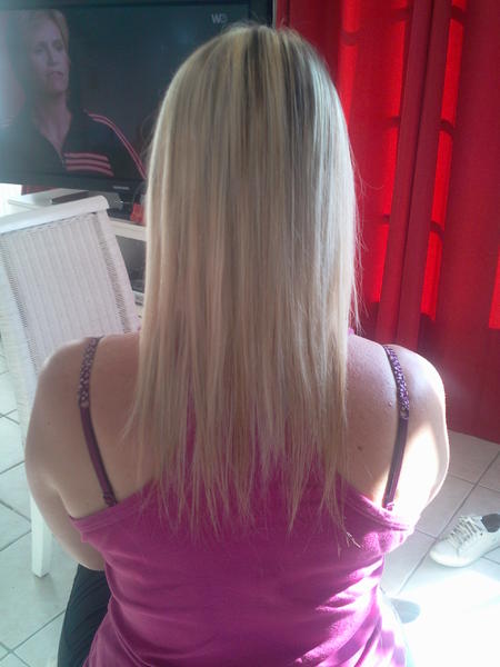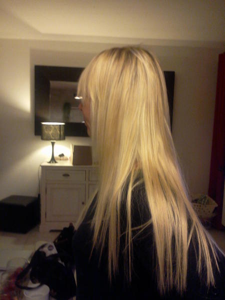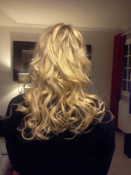 voilà une nouvelle pose a froid sur ma soeur enfin une blonde lol!!!!! il y a a peu près 100 mèches easy loop de chez samiflo voilà!!!!