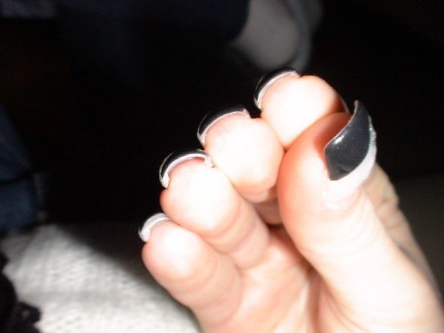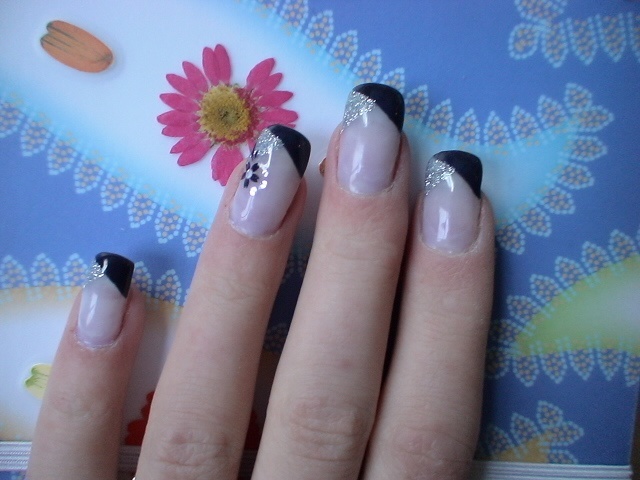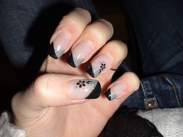 coucou a toute!!! voila j ai refait ma pose, la deco est pas super originale mais ca peut en interesser certaines peut etre. donc deco au gel noir et gel pailleté argent avec stickers de l'onglerie.be.