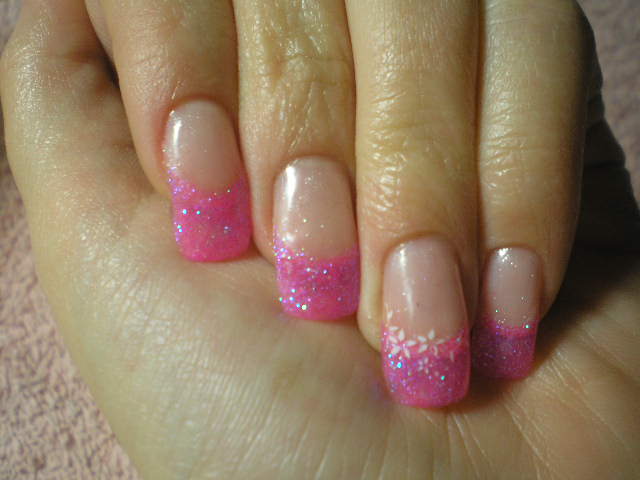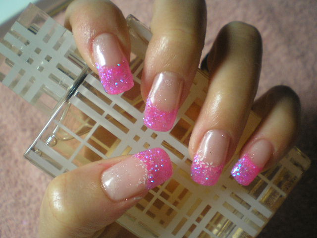 French pailletté pink (( avec petite paillette violette )) et déco au tampon