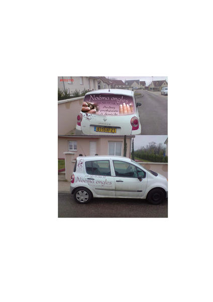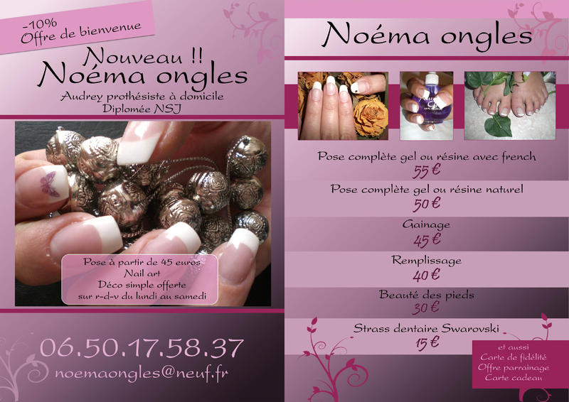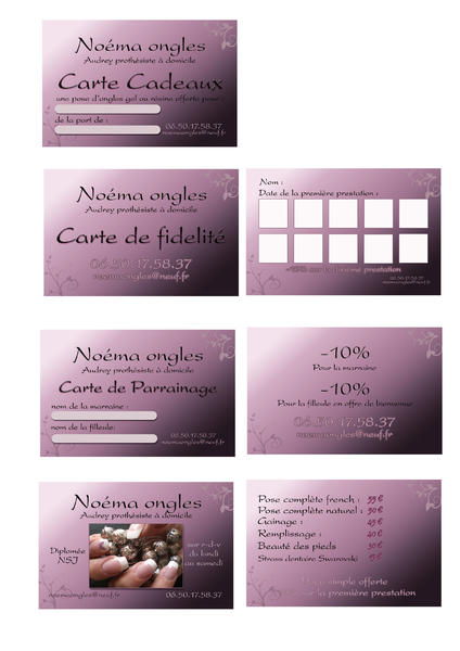 donc voiture, flyers et cartes en tout genre, j'ai aussi une affichette fait dans le meme theme avec les tarifs que j'ai affiché dans ma piece, tout mes tampon avec coordonnées siret etc..et enfin tampon fidélité un "n" pour noéma ongles.
