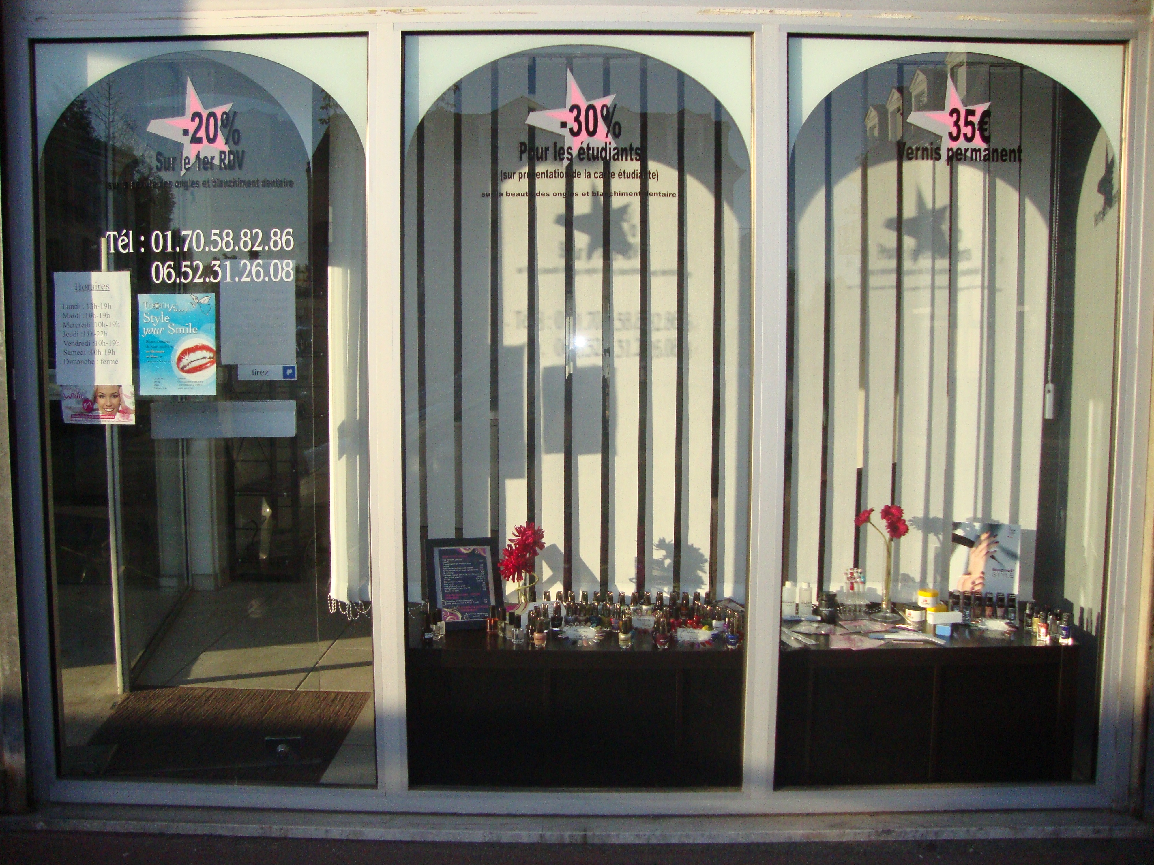 Beauté des ongles, blanchiment dentaire, tattoo éphèmére, strass dentaire et vente de produit pour les ongles.