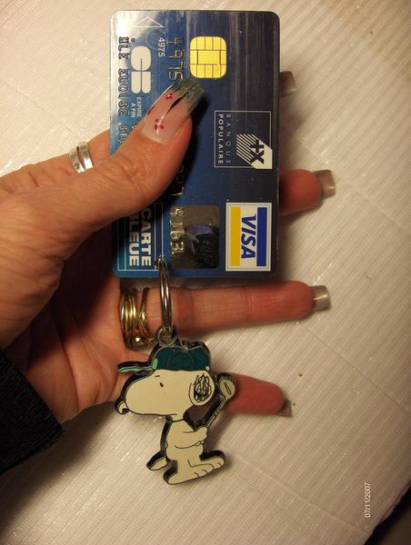 Mais cet aprèm en rangeant mon materiel j'ai eu une idée en voyant ma pince a piercing! J'ai tout bêtement percée ma carte bleue et inserer un anneau de clef! L'idéal serait un ruban quelconque!