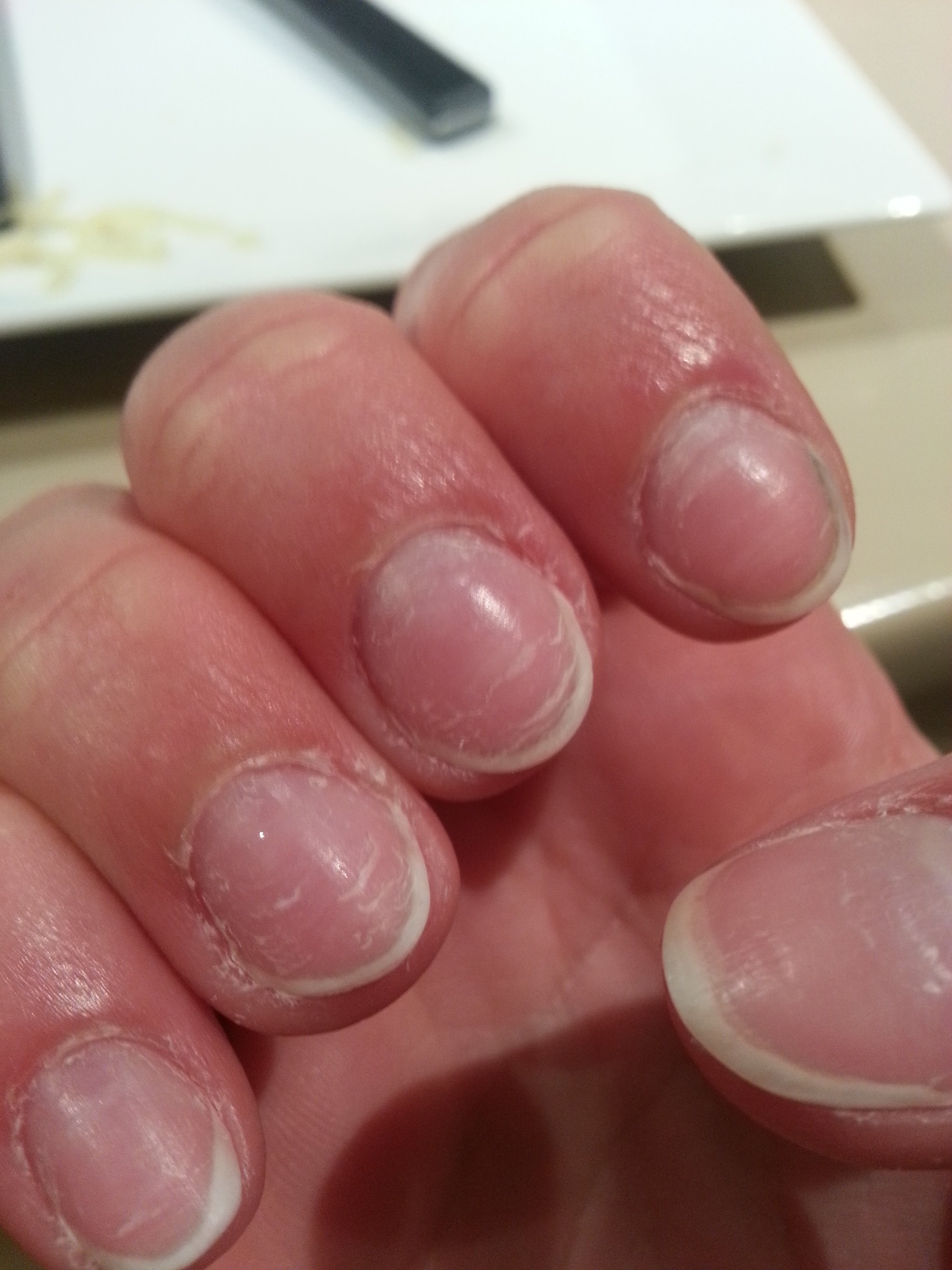 J'ai eu un petit accident avec ma pose et tous mes ongles, ou presque, se sont littéralement arrachés. Le résultat m'a effrayé ! (et j'ai failli pleurer je l'avoue...