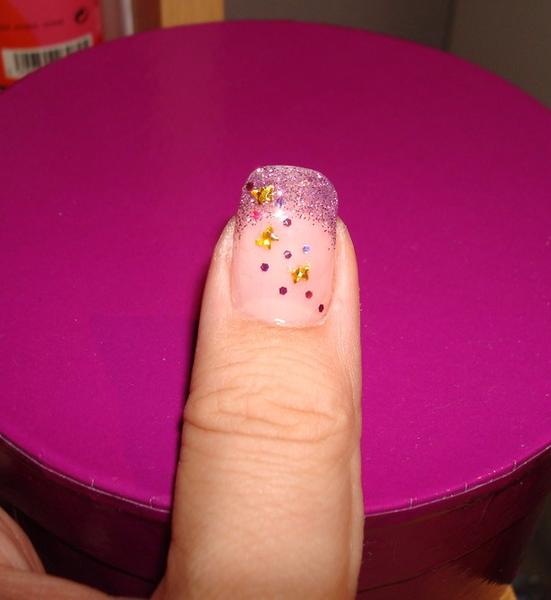 Voici ma 3ème pose, paillettes mauves et déco papillons et grosses paillettes roses