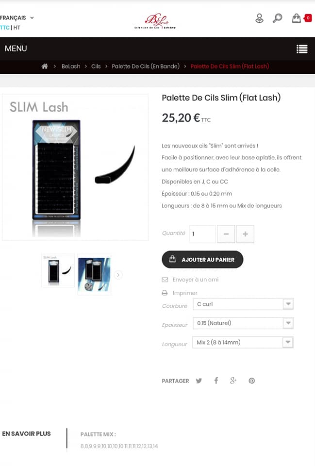 • 1 palette de cils en bande "Slim" (cils plats), C curl, 0.15, mix de longueurs 8 à 14 mm. Neuve, jamais ouverte.