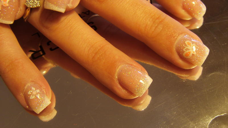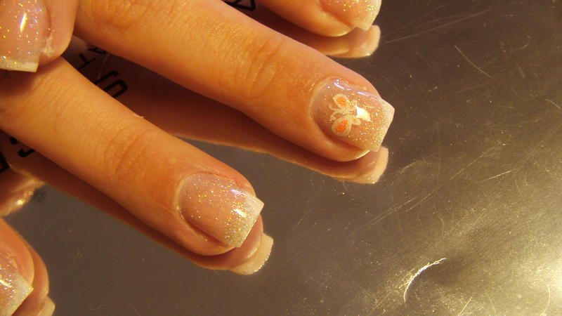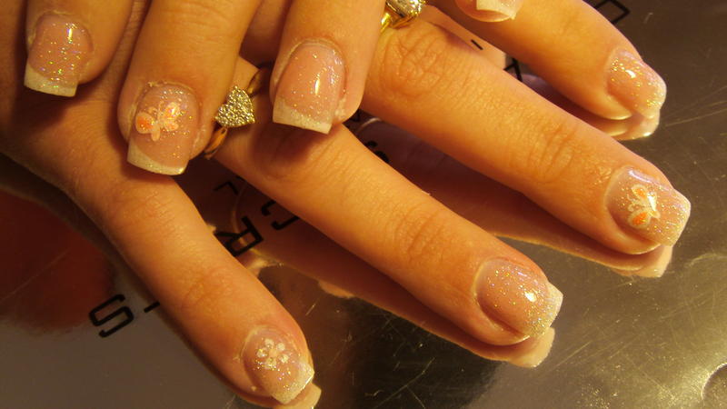 et voici une de mes dernière pose... qui reste très simple en nail art juste pose de stickers...et ui ambre ma cliente a tranché avec le stickers lol:cute:french diagonale, et finition paillettée.