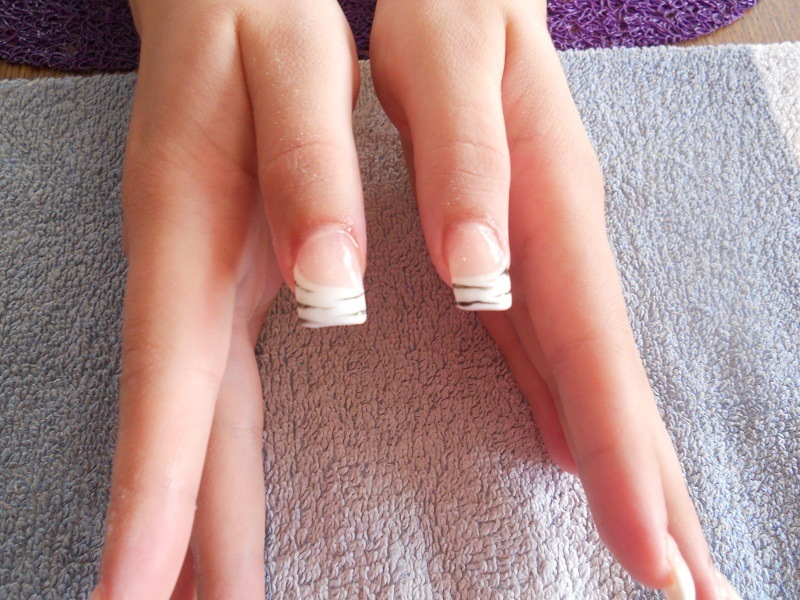 Je fais la pose, elle m'a demandé une french blanche avec du zébré noir , je le fais lui demande si les traits lui vont etc oui oui oui tout est parfait super nickel