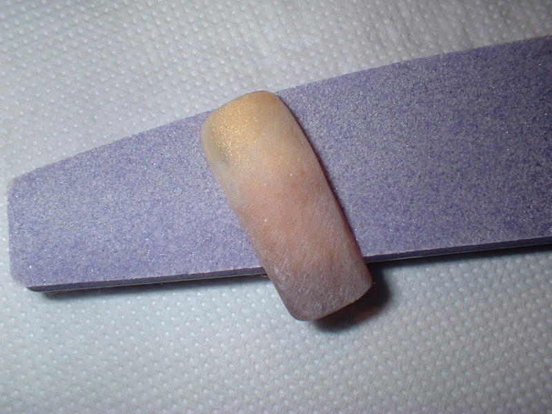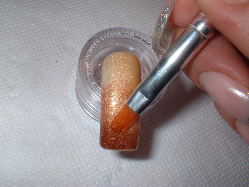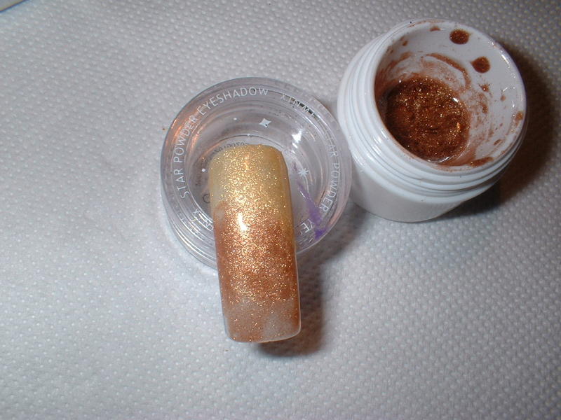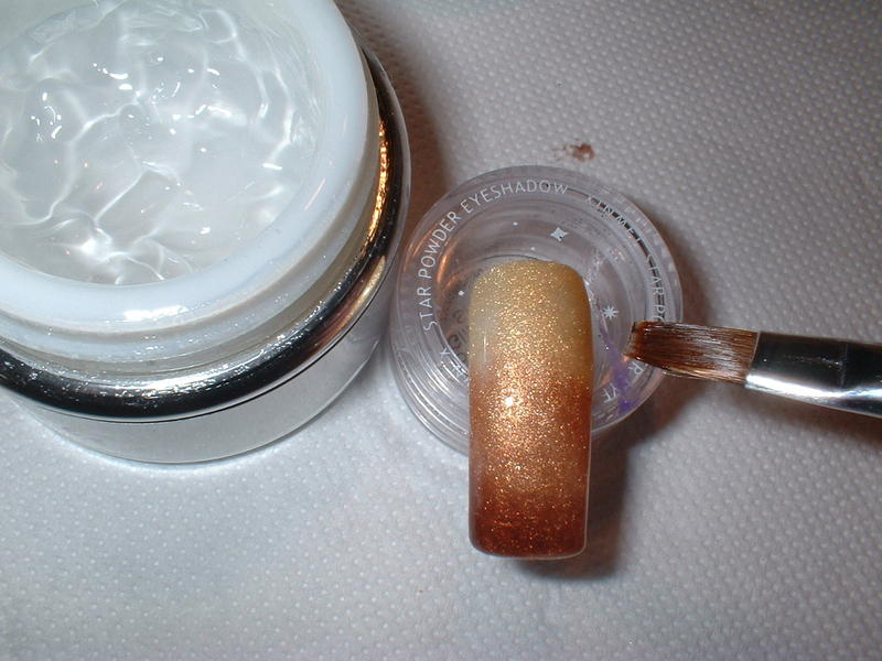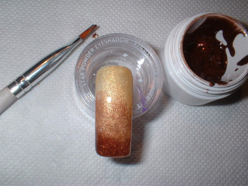 -3- Appliquer le gel beige doré en estompant vers le bas, et sur le doré (légèrement!). Ne pas catalyser!
