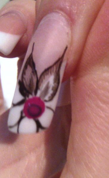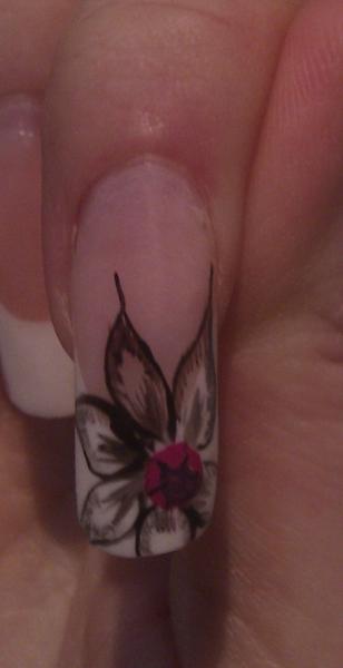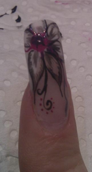 avant de mettre le gel de finition j'ai rajouté au centre des paillettes violettes en vernis ainsi que sur l'extremité des pétales.